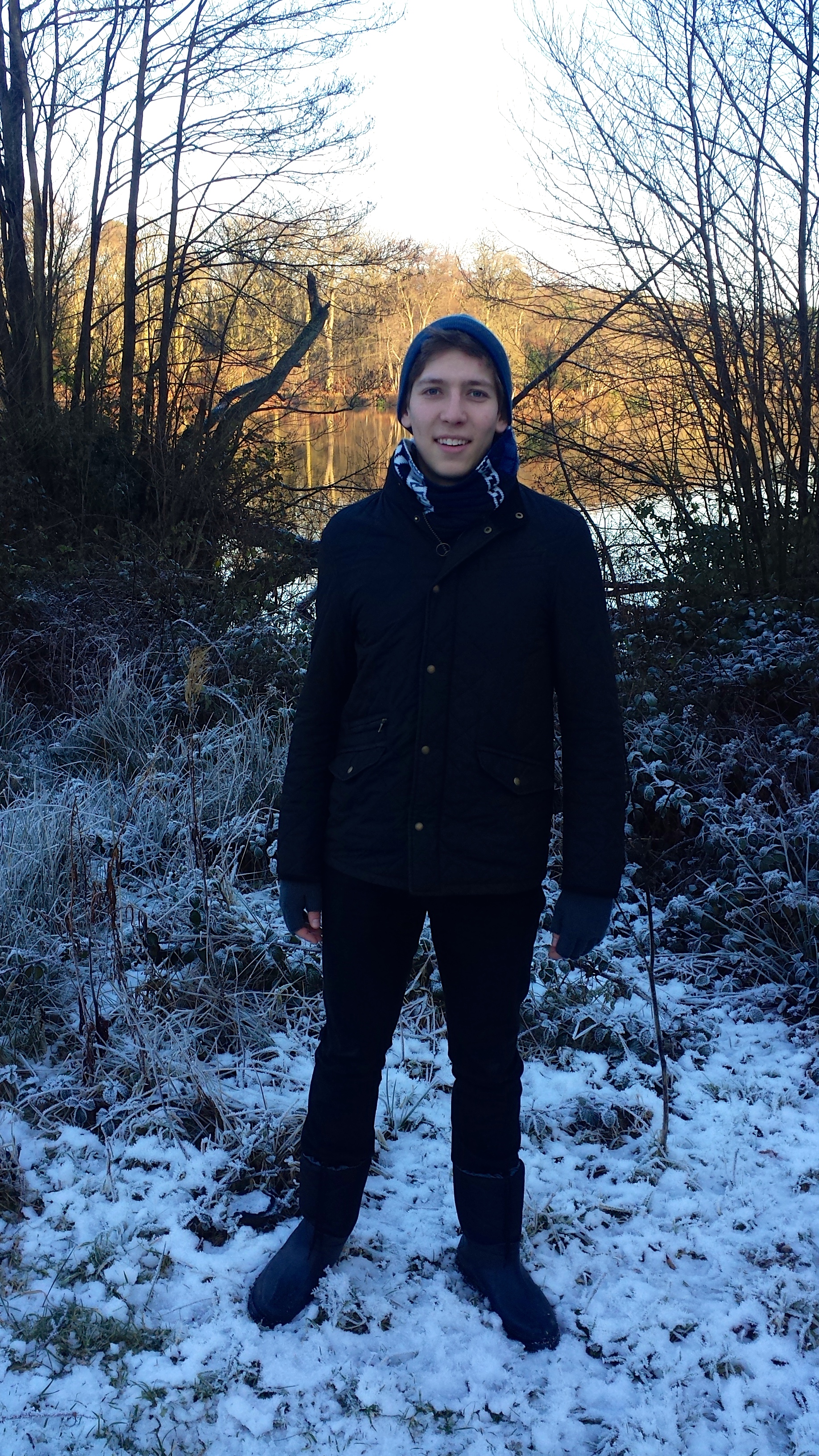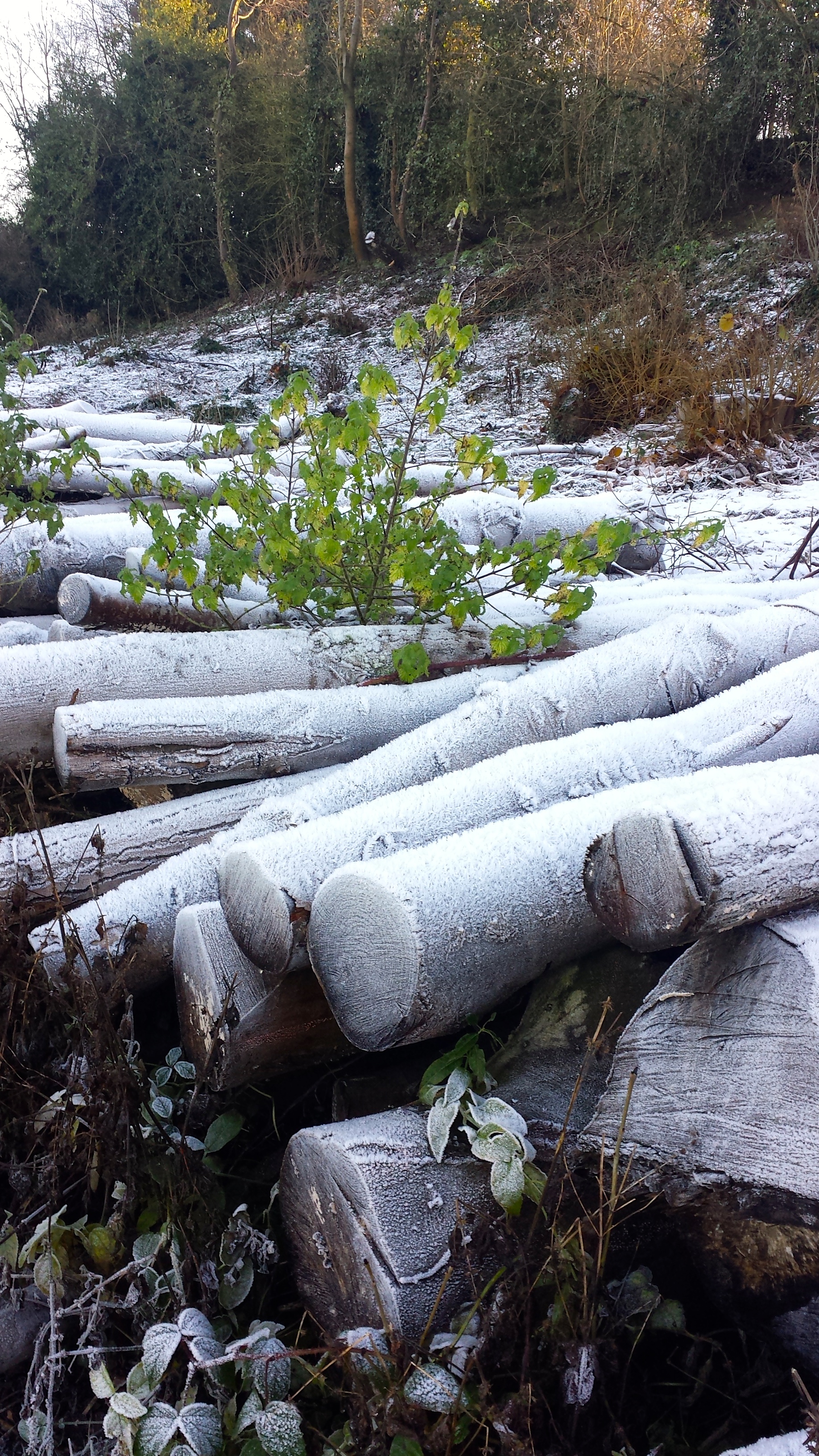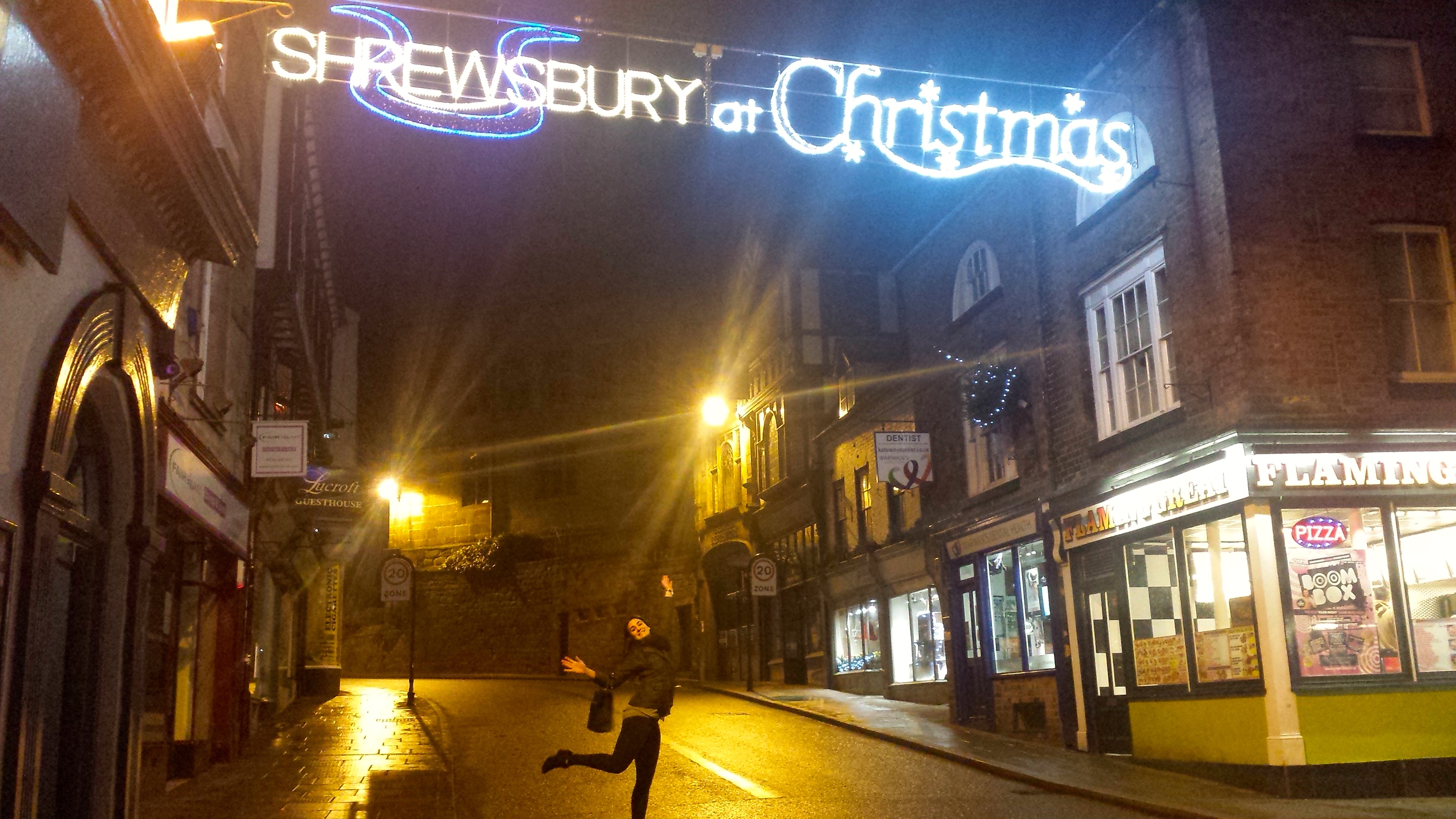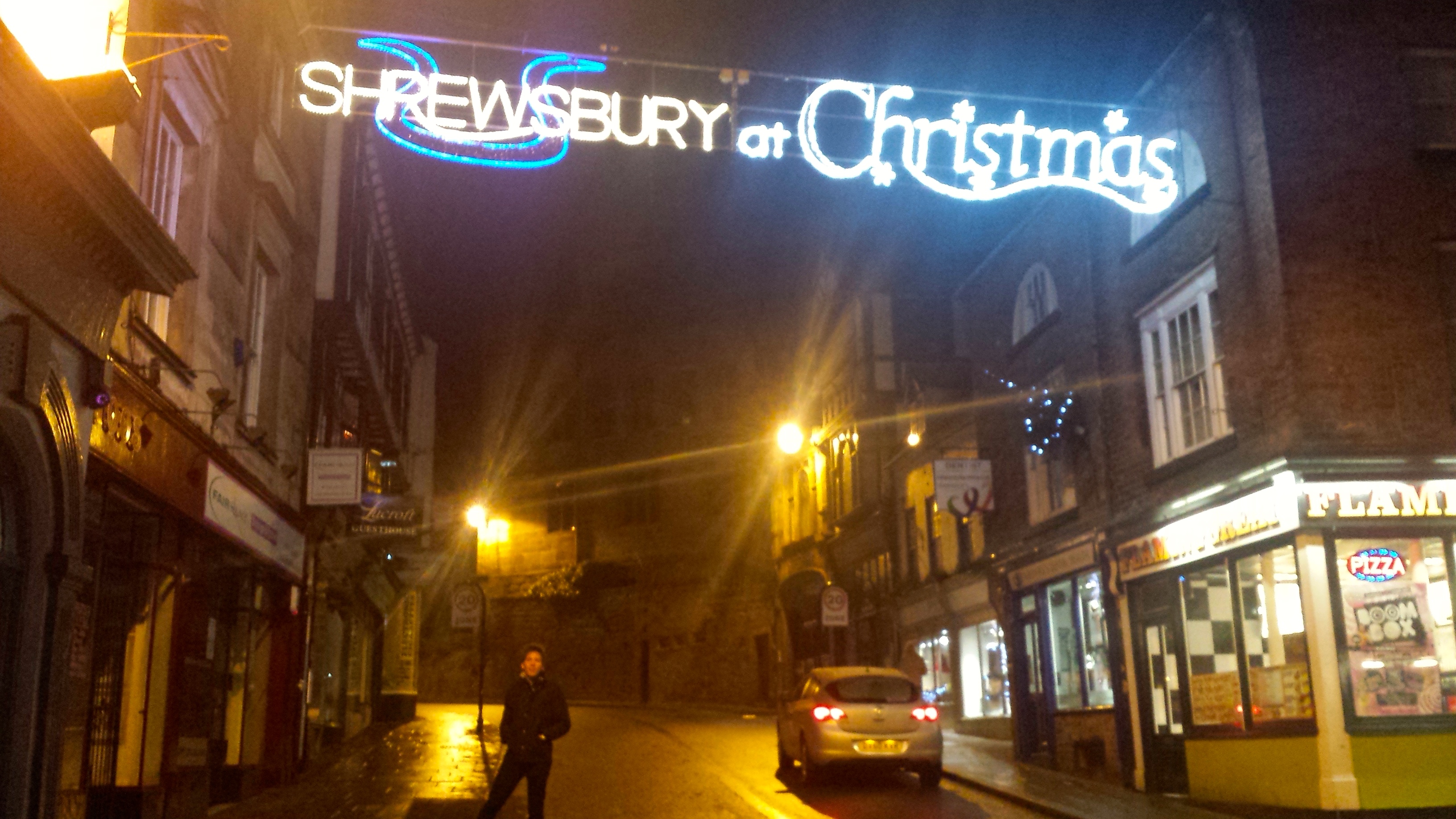 Working Tom’s Artic scarf in Shrewsbury town centreTom and I at Shrewsbury Town CentreShrewsbury Town CentreShrewsbury at ChristmasShrewsbury at ChristmasOn our walk in the Wem countrysideThe pathSnow on logsTom and his friend, Seb, dropping me at the train station