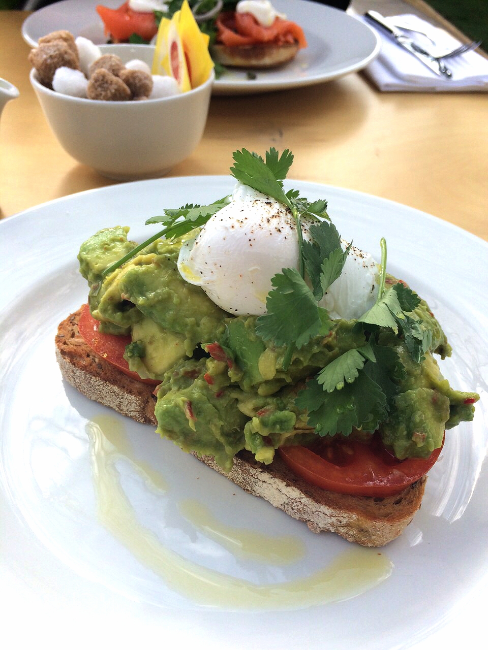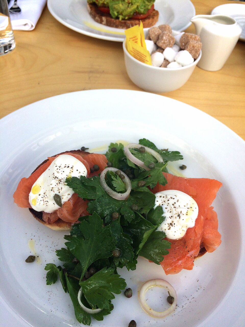 Being overwhelmed with the menu choices, we finally decided on the avocado on sourdough (with a poached egg!) and a classic smoked salmon English muffin to be split amongst the two of us, so we could each get the best of both worlds!